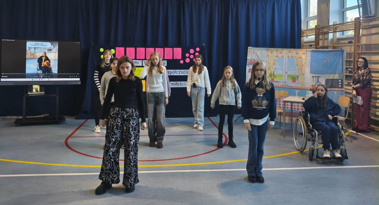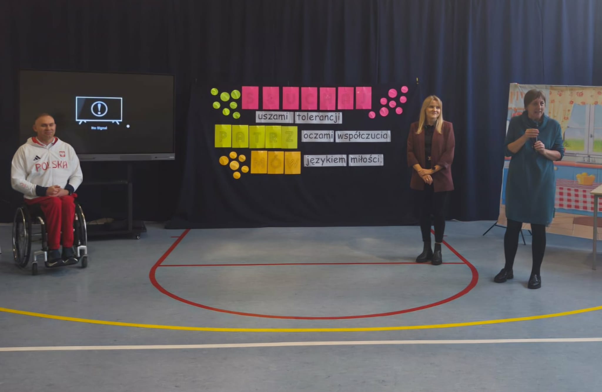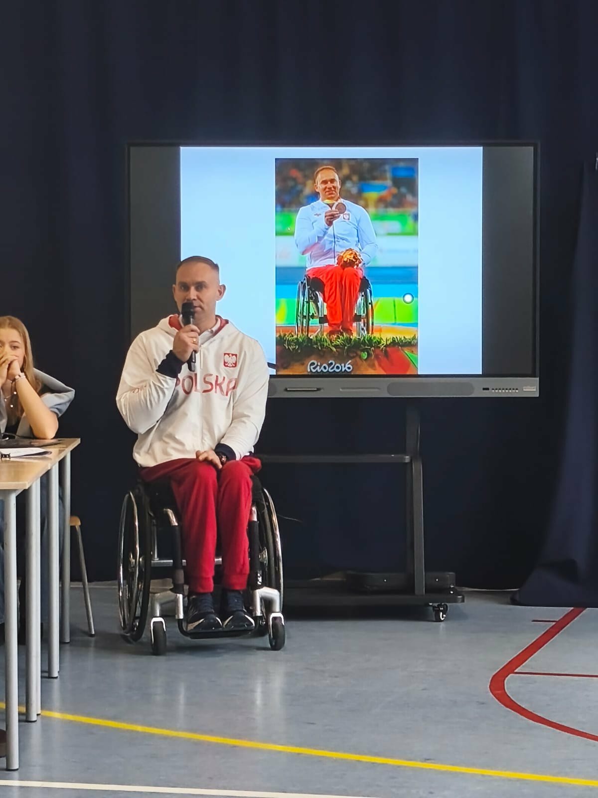 Na początku spotkania uczniowie klas młodszych przedstawili podstawowe prawa dziecka. Następnie mogliśmy obejrzeć przedstawienie pt. "Inna, a jednak taka sama" przygotowane przez nasze szkolne koło teatralne. Kolejnym etapem była prelekcja naszego gościa pana Lecha Stoltmana - polskiego niepełnosprawnego lekkoatlety, specjalizującego się w pchnięciu kulą, wielokrotnego medalisty igrzysk paralimpijskich i mistrzostw świata. Pan Lech opowiedział nam swoją historię pokazując jednocześnie, że pomimo niepełnosprawności można realizować swoje pasje i osiągać kolejne sukcesy. Z zaskoczeniem słuchaliśmy opowieści o kolejnych sportowych etapach w życiu naszego gościa, zainteresowaniach (strzelectwo, jazda ma quadzie) i codziennym funkcjonowaniu. To wystąpienie pokazało nam, że ograniczenia często są wyłącznie w naszych głowach, wynikające z własnych lęków, przekonań i sposobu myślenia, a nie z obiektywnych przeszkód.
