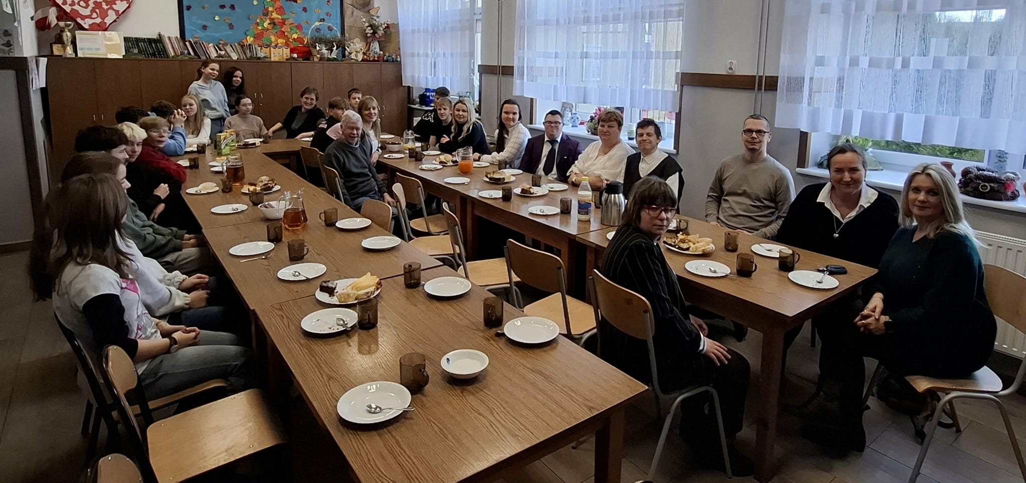 Mieliśmy również zaszczyt gościć uczestników Warsztatów Terapii Zajęciowej w Chojnicach, którzy po zakończonym spotkaniu uczestniczyli w słodkim poczęstunku przygotowanym przez uczniów klasy 8. Nasze spotkanie umilił występ Miłosza- uczestnika warsztatów który z powodzeniem udawał głos znanego wszystkim Jokera.