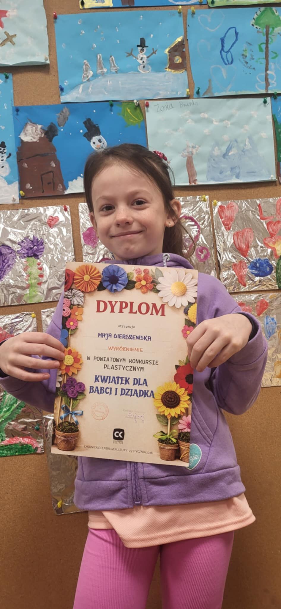 16 stycznia 2026 r. ogłoszono wyniki powiatowego konkursu plastycznego zorganizowanego przez Chojnickie Centrum Kultury z okazji Dnia Babci i Dziadka. Nasza uczennica z klasy 1a Maja Gierszewska otrzymała wyróżnienie. Serdecznie gratulujemy i życzymy dalszych sukcesów!