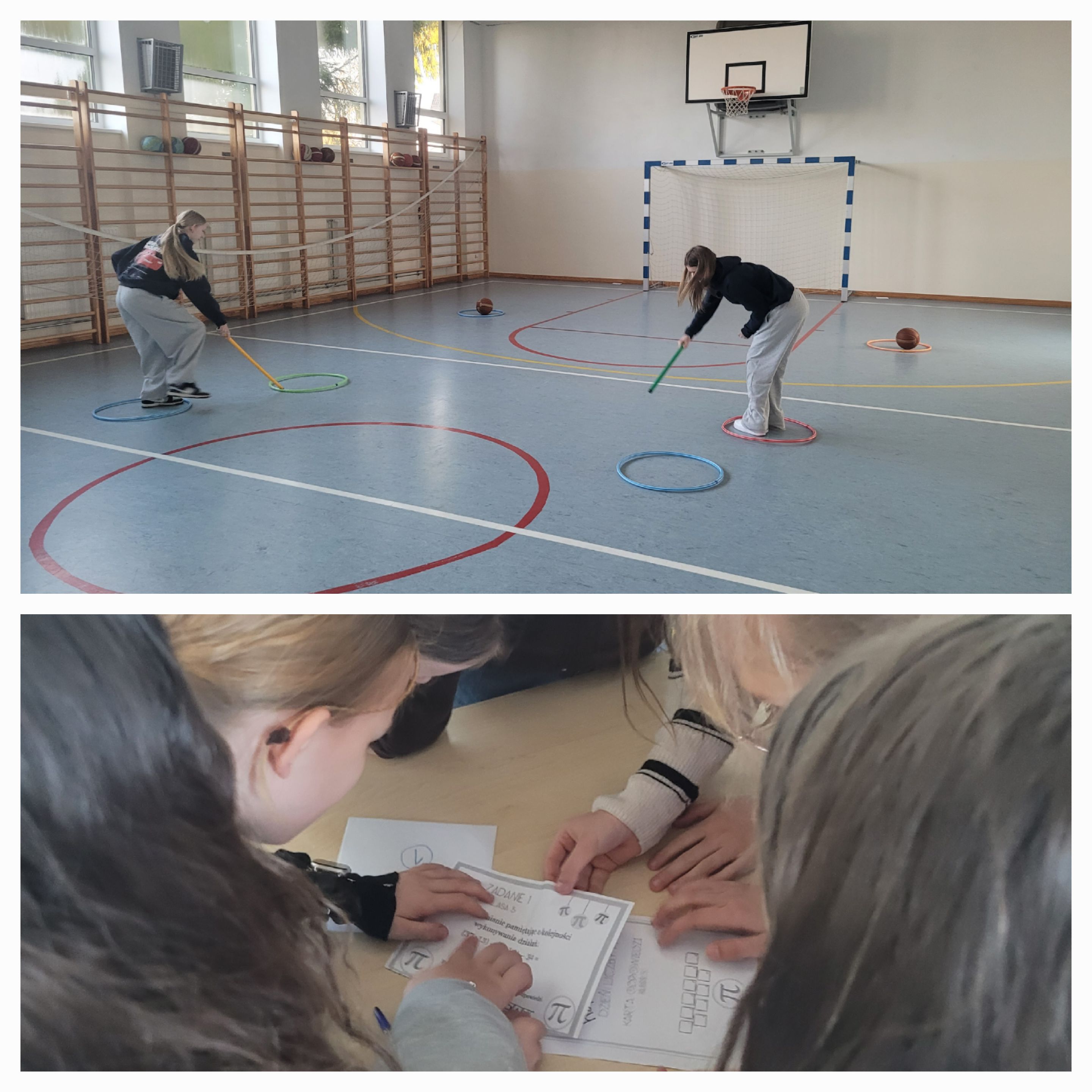 Głównym punktem programu była „Sztafeta zadaniowa – Dzień Liczby Pi” na sali gimnastycznej. Emocji nie brakowało! Uczniowie musieli wykazać się zręcznością, pokonując tor przeszkód wewnątrz kół hula-hop, rozwiązując drużynowe zadania i celując do kosza.
