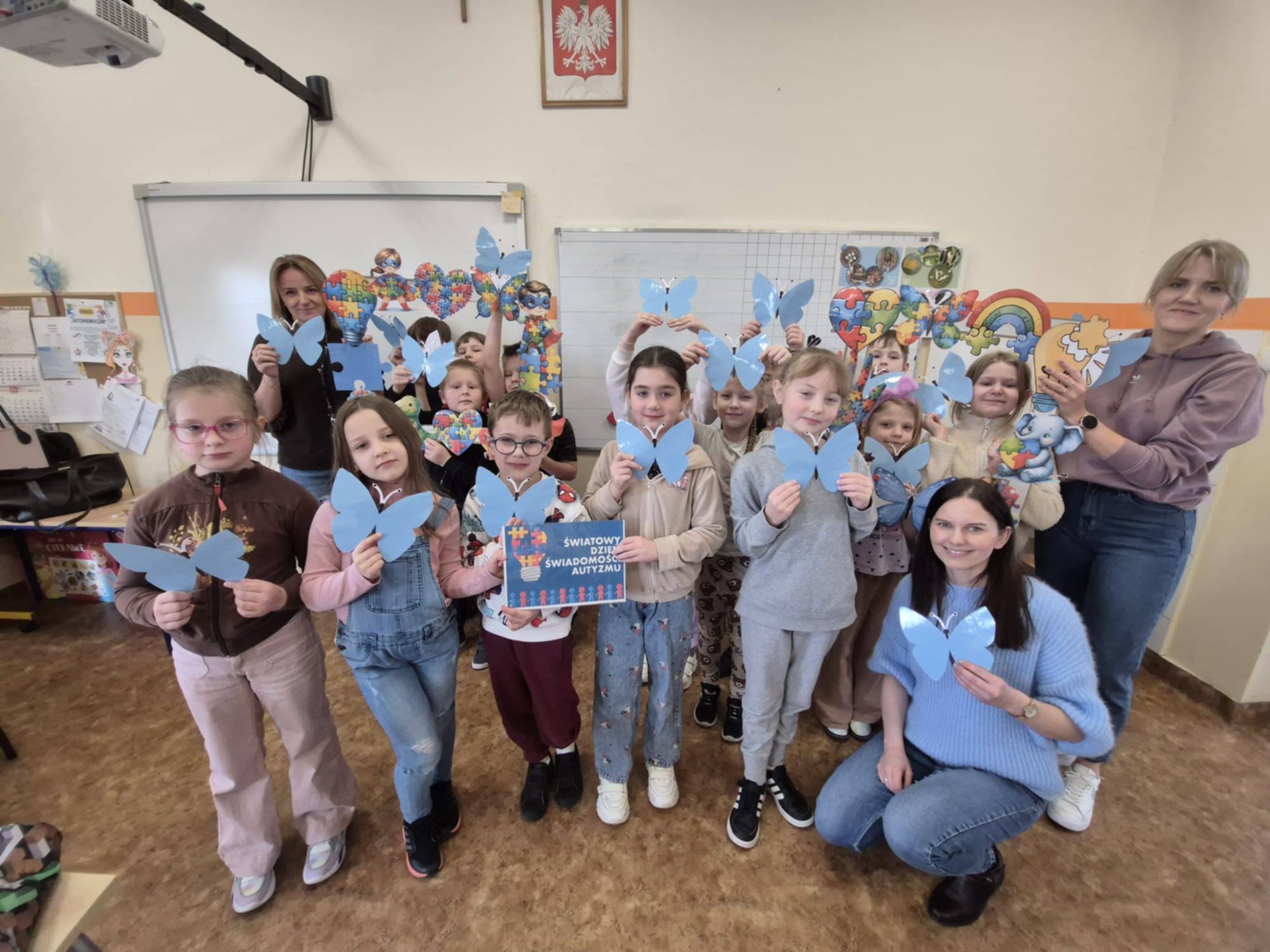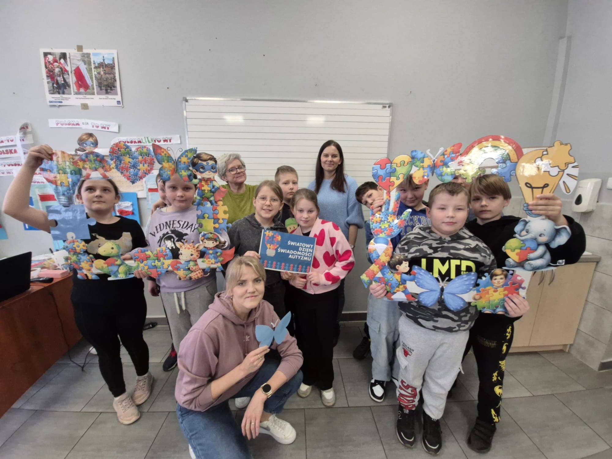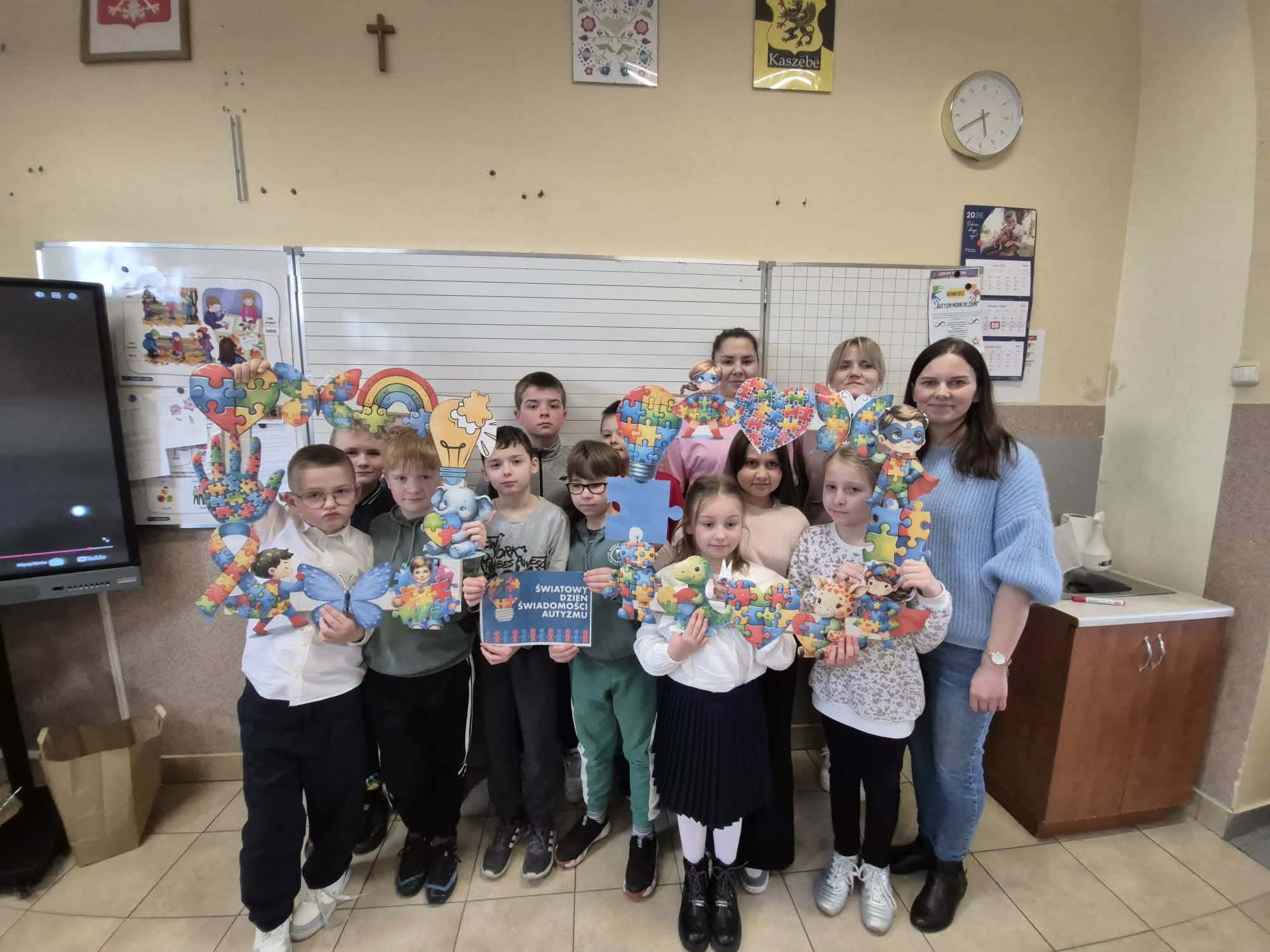 Z okazji Światowego Dnia Świadomości Autyzmu, który obchodzony jest 2 kwietnia, w naszej szkole w minionych dniach w klasach I-III odbyły się zajęcia związane z tematyką autyzmu. Dzieci miały okazję obejrzeć krótki film, przedstawiający życie i codzienne funkcjonowanie tych osób. Był to czas pełen rozmów, refleksji, a także możliwości zadawania pytań, dzięki czemu uczniowie zdobyli nową wiedzę oraz pogłębili tą już nabytą. Dzieci otrzymały puzzle do pokolorowania, które zawierały hasła na znak solidarności osób z autyzmem. Nasza szkoła uczestniczyła również w akcji "Zaświeć się na niebiesko", polegającej na założeniu niebieskiego elementu garderoby, chcąc w ten sposób wyrazić swoją jedność i wsparcie. Na koniec wszyscy razem ustawili się do pamiątkowego zdjęcia.